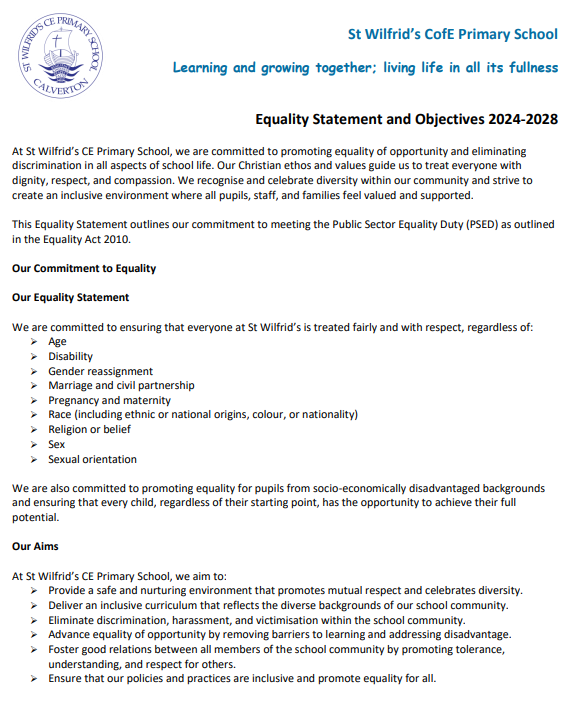 Here's a comprehensive Equality Statement 2024-25 for St Wilfrid's CE Primary School, including the school's equality objectives and in line with UK statutory requirements: